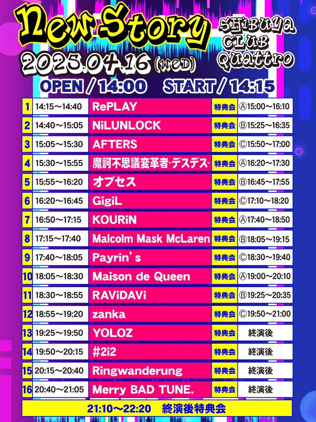 AFTERS , オブセス , GigiL , KOURiN , zanka , #2i2 , NiLUNLOCK , Payrin’s , 魔訶不思議変革者-デスデス- , Malcolm Mask McLaren , Maison de Queen , Merry BAD TUNE. , YOLOZ , RAViDAVi , RePLAY , Ringwanderung